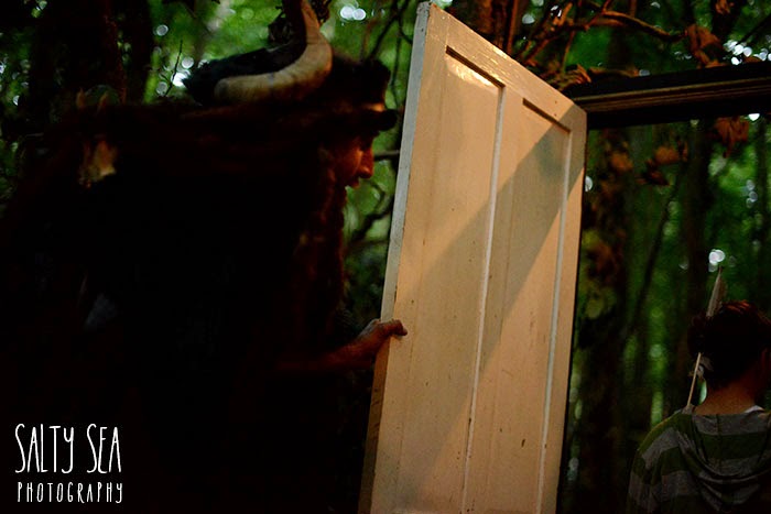 But along the way, you behold a series of living stories, incredible installations and glimpses into the folk tales of which you shall shortly be told. Two star-crossed bandits, A fire dancer, A mermaid's grotto and a rather prim and proper spider lady. The tree branches are adorned with mismatched lampshades that would ordinarily belong your grandmother's front room, ornate mirrors twinkling and bizarre old photographs of.. is that a fairy?. All preparing you for your trip through the door, greeted by the Woodland king and your journey to the other side. The Land of Fae.